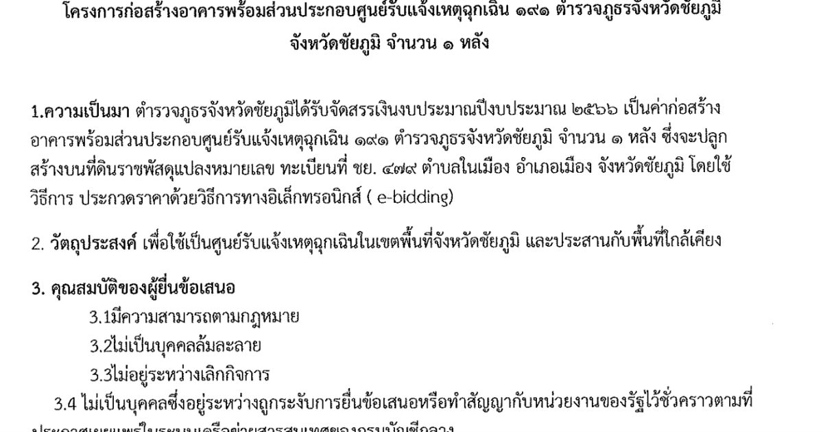 ร่างขอบเขตของงาน (Terms of Reference : TOR)โครงการก่อสร้างอาคารศูนย์รับแจ้งเหตุฉุกเฉิน ๑๙๑ ตำรวจภูธรจังหวัดชัยภูมิ จำนวน ๑ หลัง