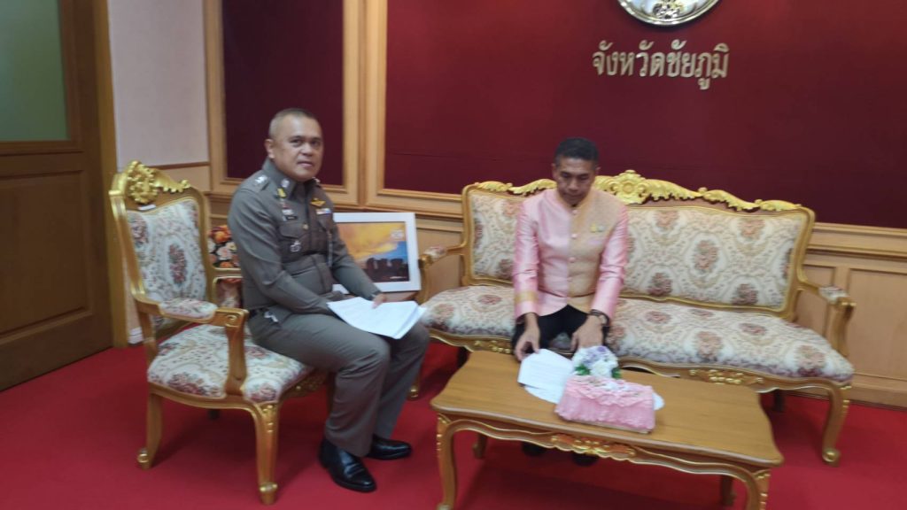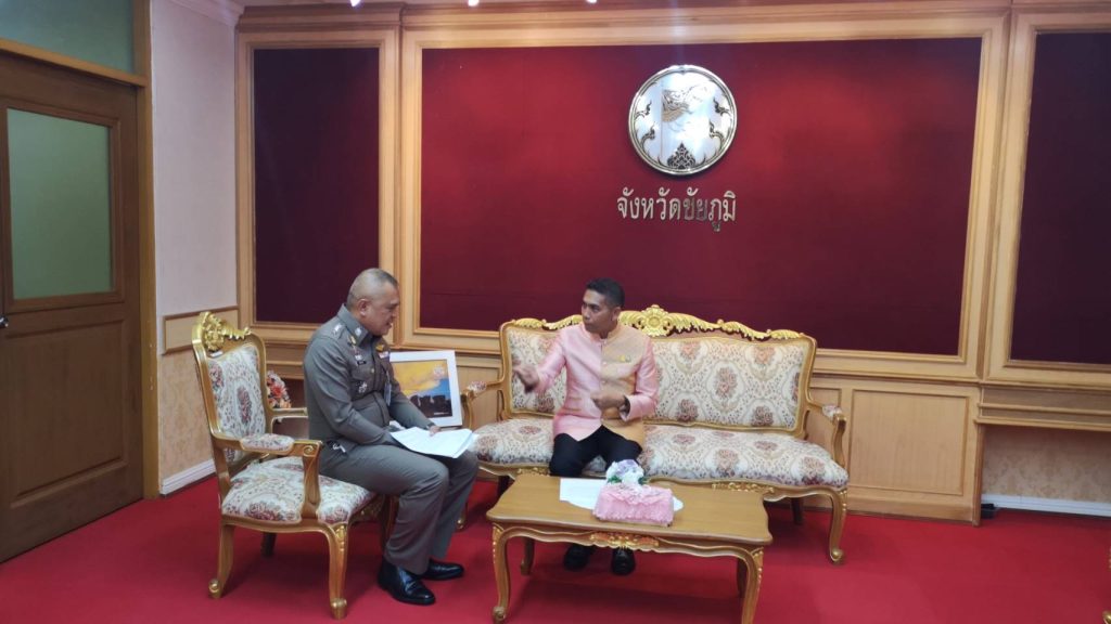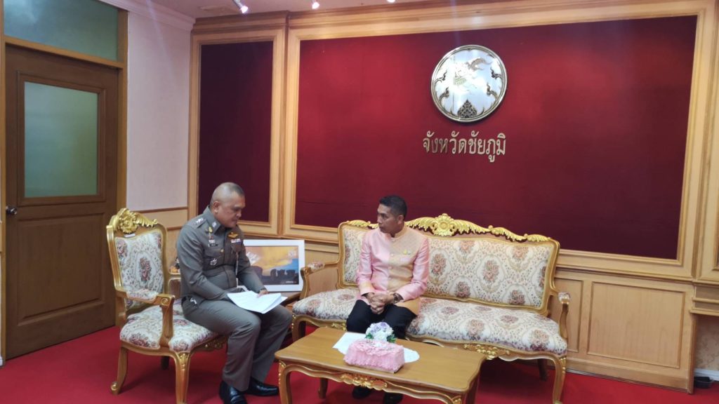 25 ก.ค.66 เวลา 14.30 น. พ.ต.อ.พิชิต มีแสง รอง ผบก.ภ.จว.ชัยภูมิ เข้าพบนายโสภณ สุวรรณรัตน์ ผู้ว่าราชการจังหวัดชัยภูมิ เพื่อสรุปผลการดำเนินโครงการชุมชนยั่งยืน ฯ พ.ศ.2566 ภ.จว.ชัยภูมิ พร้อมทั้งหารือในประเด็นปัจจัยแห่งความสำเร็จในการบำบัดฟื้นฟูยาเสพติดโดยการมีส่วนร่วมของชุมชน (Community based treatment and rehabilitation : CBTx) ” ของการดำเนินโครงการดำเนินงานชุมชนยั่งยืนฯ และโครงการ 1 ท้องถิ่น 1 ชุมชนยั่งยืน ณ ห้องประชุมชั้น 2 ศาลากลางจังหวัดชัยภูมิ