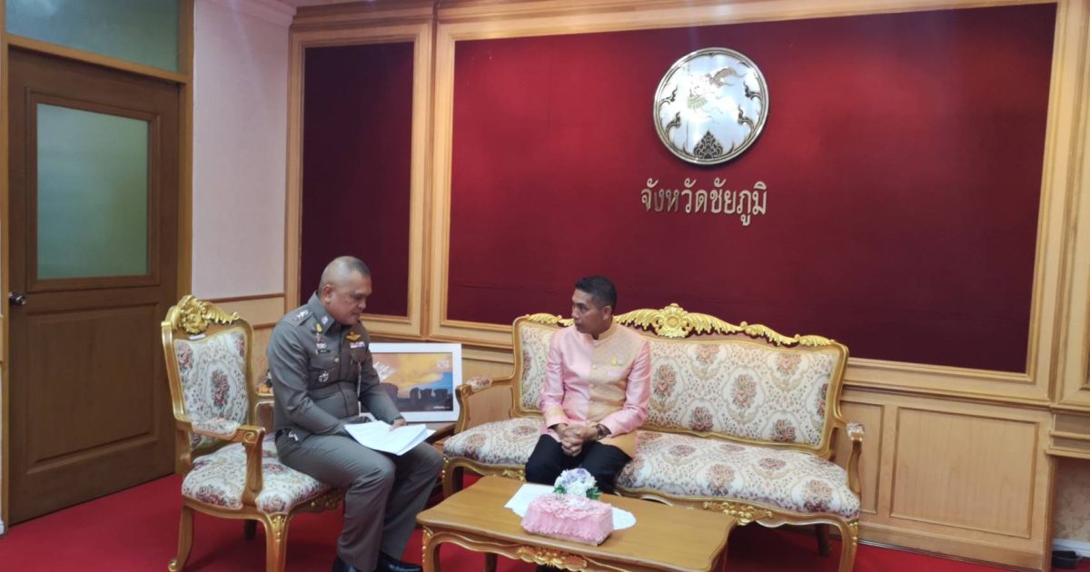 25 ก.ค.66 เวลา 14.30 น. พ.ต.อ.พิชิต มีแสง รอง ผบก.ภ.จว.ชัยภูมิ เข้าพบนายโสภณ สุวรรณรัตน์ ผู้ว่าราชการจังหวัดชัยภูมิ เพื่อสรุปผลการดำเนินโครงการชุมชนยั่งยืน ฯ พ.ศ.2566 ภ.จว.ชัยภูมิ พร้อมทั้งหารือในประเด็นปัจจัยแห่งความสำเร็จในการบำบัดฟื้นฟูยาเสพติดโดยการมีส่วนร่วมของชุมชน (Community based treatment and rehabilitation : CBTx) ” ของการดำเนินโครงการดำเนินงานชุมชนยั่งยืนฯ และโครงการ 1 ท้องถิ่น 1 ชุมชนยั่งยืน ณ ห้องประชุมชั้น 2 ศาลากลางจังหวัดชัยภูมิ