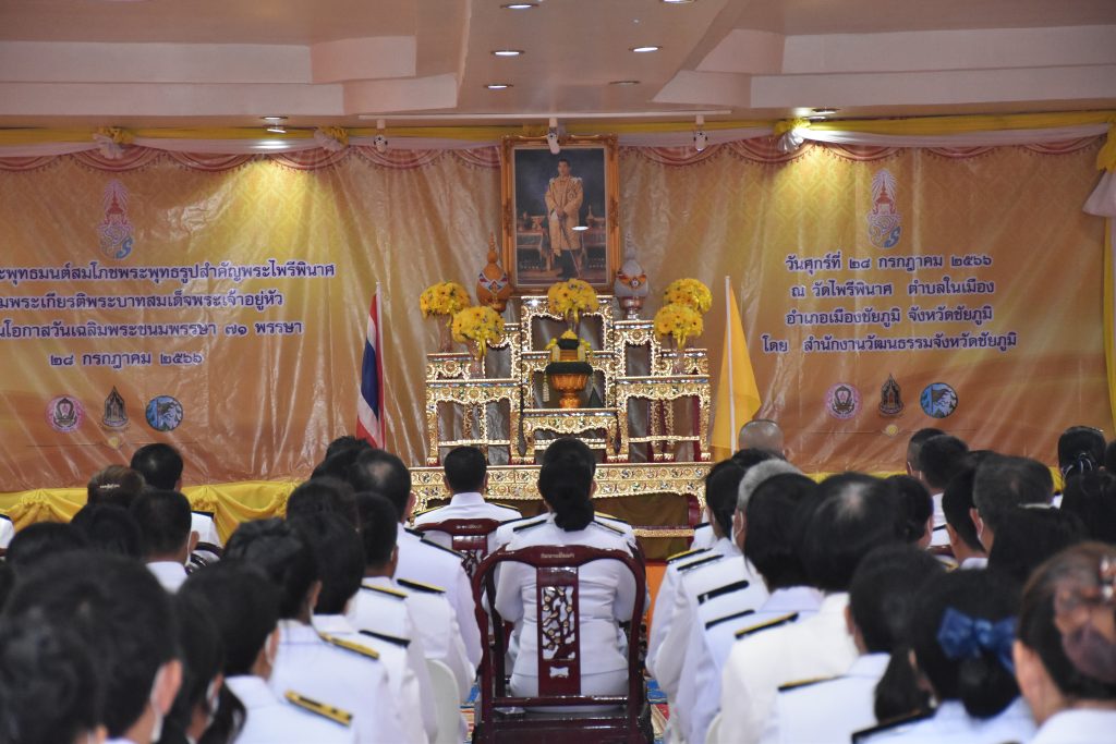 เวลา ๙.๔๕ น. ร่วมพิธีเจริญพระพุทธมนต์สมโภชพระพุทธรูปสำคัญพระไพรีพินาศ เฉลิมพระเกียรติพระบาทสมเด็จพระเจ้าอยู่หัว เนื่องในวันเฉลิมพระชนมพรรษา วันที่ ๒๘ ก.ค. ๖๖ ณ วัดไพรีพินาศ อำเภอเมืองชัยภูมิ จังหวัดชัยภูมิ