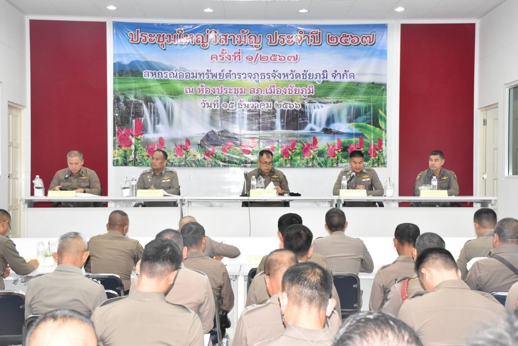 15 ร.ค. 2566 เวลา 10.00 น. พล.ต.ต.สุชาติ คล้ายจันทร์พงษ์ ผบก.ภ.จว.ชัยภูมิ พร้อมด้วย พ.ต.อ.ยรรยง จันทร์เขียว, พ.ต.อ.อิทธิโชค เกิดผล และ พ.ต.อ.ปราโมทย์ สิมหลวง รอง ผบก.ชัยภูมิ ประชุมใหญ่วิสามัญประจำปี 2567 ครั้งที่ 1/2567 สหกร์ออมทรัพย์ตำรวจภูธรจังหวัดชัยภูมิ ณ ห้องประชุม ชั้น 4 สภ.เมืองชัยภูมิ