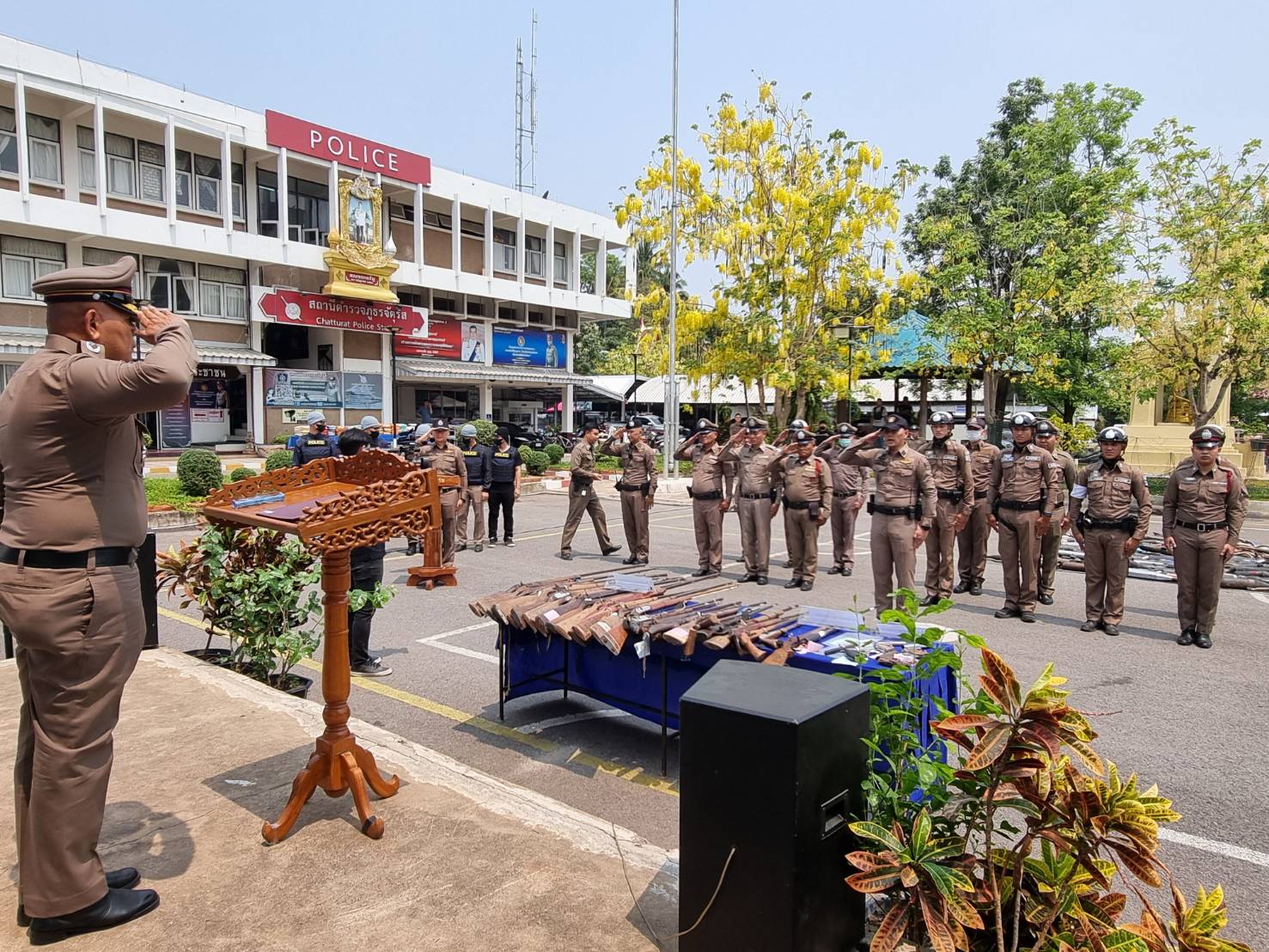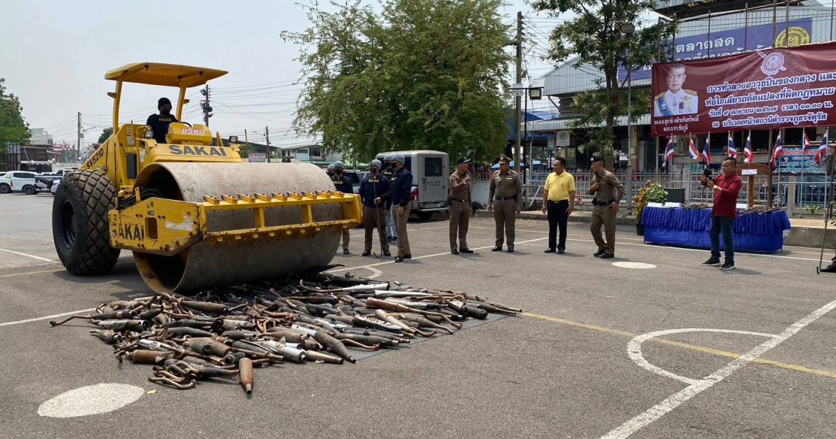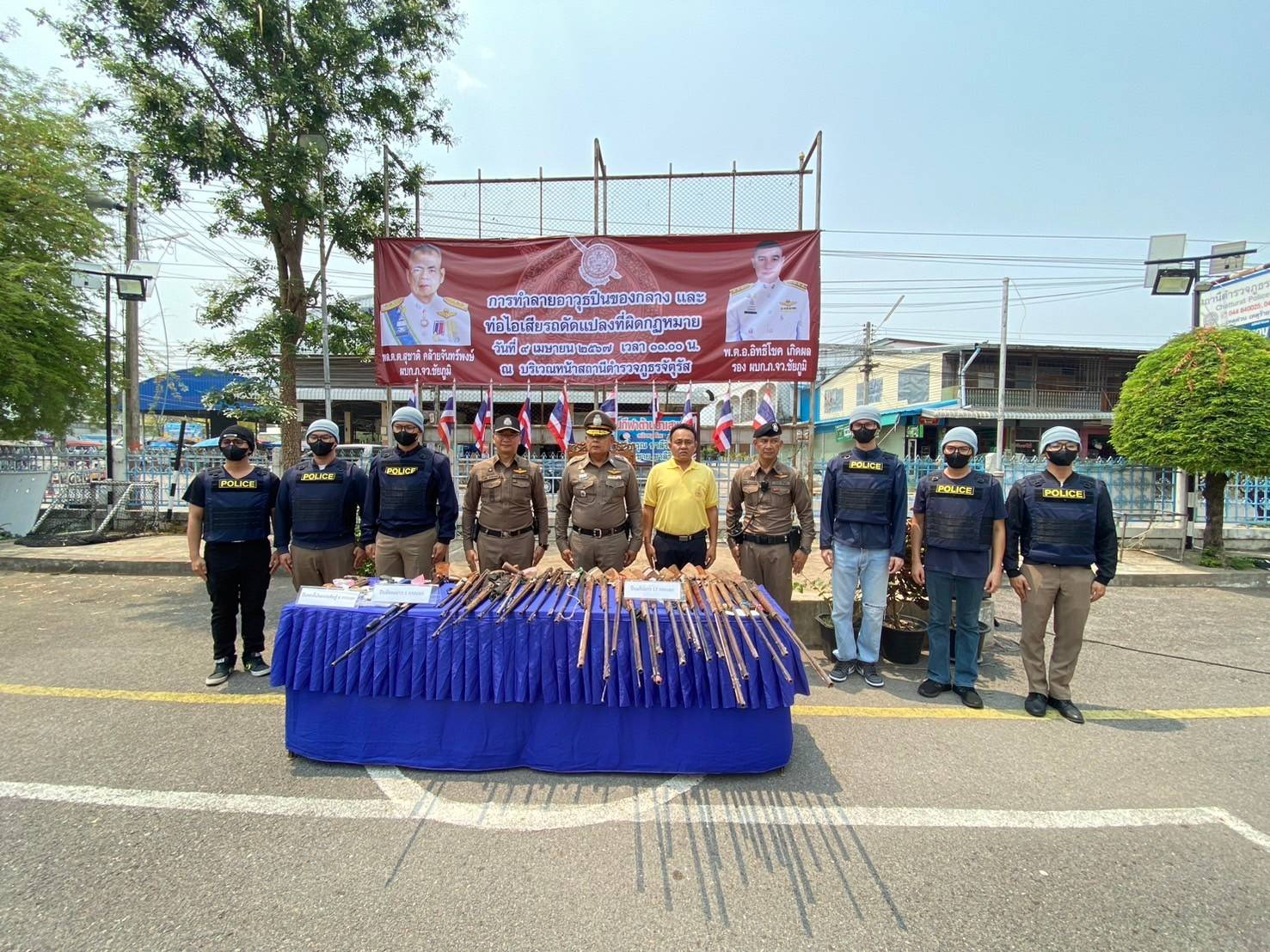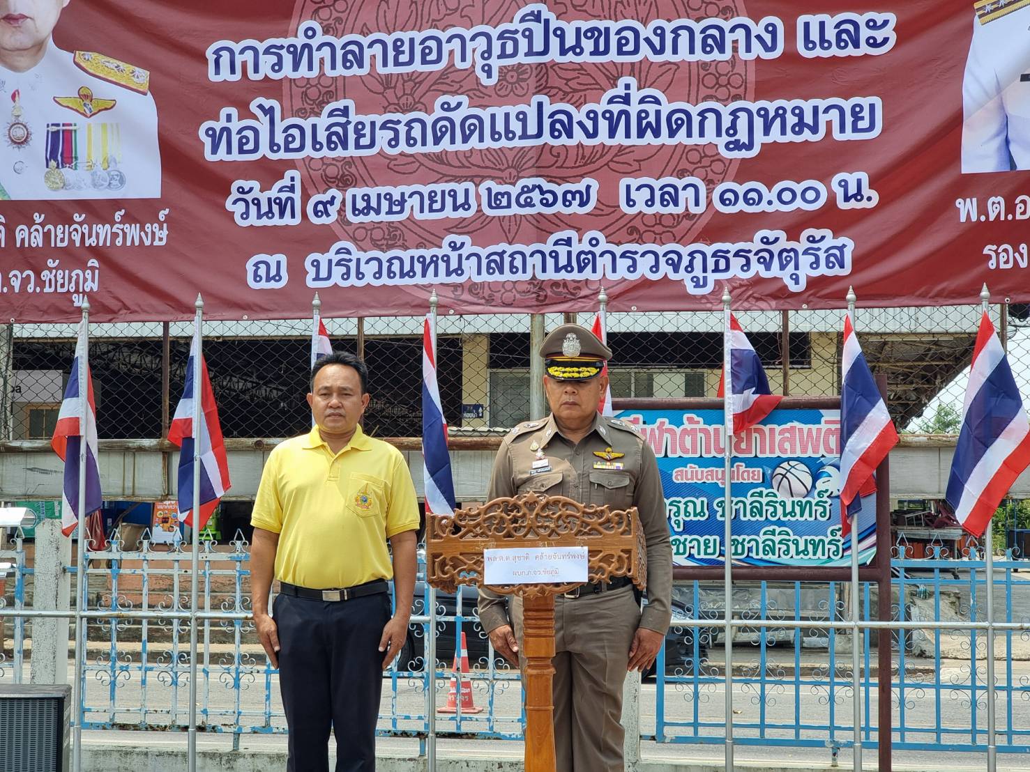 พล.ต.ต.สุชาติ คล้ายจันทร์พงษ์ ผบก.ภ.จว.ชัยภูมิ ร่วมพิธีการทำลายอาวุธปืนของกลาง และท่อไอเสียรถดัดแปลงที่ผิดกฎหมาย ของ สภ.จัตุรัส
