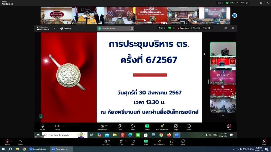 30 ส.ค.67 เวลา 13.30 น. พล.ต.ต.สุชาติ คล้ายจันทร์พงษ์ ผบก.ภ.จว.ชัยภูมิ พร้อมด้วย พ.ต.อ.อิทธิโชค เกิดผล รอง ผบก.ฯ, พ.ต.อ.สุขสันต์ ไตรทิพย์ รอง ผบก.ฯ, พ.ต.อ.ปราโมทย์ สิมหลวง รอง ผบก.ฯ, พ.ต.อ.วัฒนชัย จันทาทุม รอง ผบก.ฯ, ผกก.สืบสวนฯ, ผกก.(สอบสวน) กลุ่มงานสอบสวนฯ, ผกก.ฝอ.ฯ, รอง ผกก.ฝอ.ฯ, สว.ฝอ.ฯ และเจ้าหน้าที่ที่เกี่ยวข้อง ร่วมประชุมบริหาร ตร. ครั้งที่ 6/2567 ผ่านระบบ Zoom ณ ห้องประชุม ศปก.ภ.จว.ชัยภูมิ โดยมี สภ.ในสังกัดเฝ้าฟัง ณ ที่ตั้งหน่วย
