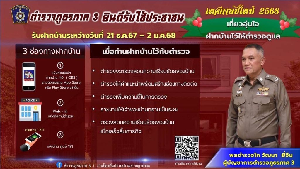 1.ตำรวจภูธรจังหวัดชัยภูมิ ยินดีรับใช้ประชาชน รับฝากบ้านช่วงเทศกาลปีใหม่ ระหว่าง 21 ธ.ค.67 – 2 ม.ค.68 เที่ยวปีใหม่อุ่นใจ ฝากบ้านไว้ให้ตำรวจดูแล