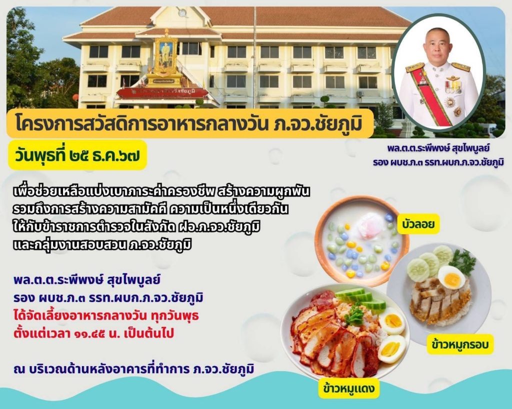 25 ธ.ค.67 เวลา 12.00 น. พล.ต.ต.ระพีพงษ์ สุขไพบูลย์ รอง ผบช.ภ.3 รรท.ผบก.ภ.จว.ชัยภูมิ
