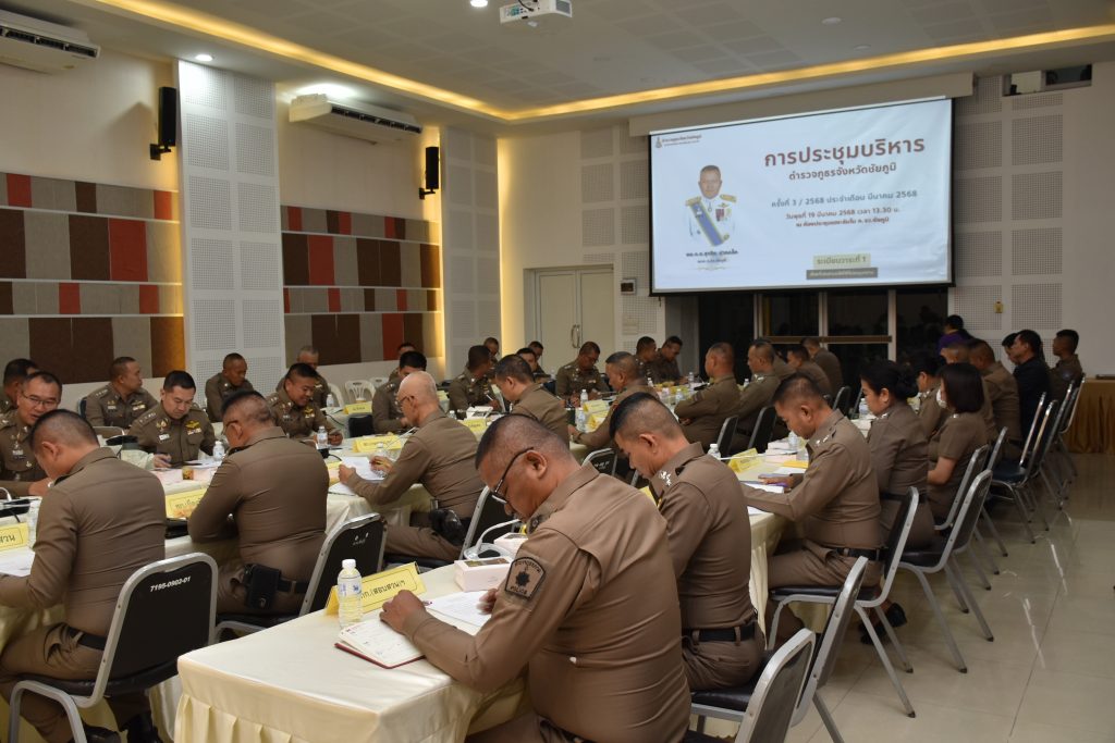 19 มี.ค.68 เวลา 13.30 น. พล.ต.ต.สุจริต ปาณเล็ก ผบก.ภ.จว.ชัยภูมิ พร้อมด้วย พ.ต.อ.อิทธิโชค เกิดผล รอง ผบก.ฯ, พ.ต.อ.พิชิต มีแสง รอง ผบก.ฯ, พ.ต.อ.สุขสันต์ ไตรทิพย์ รอง ผบก.ฯ, พ.ต.อ.อานุภาพ ผิวอ่อน รอง ผบก.ฯ และ พ.ต.อ.นิรันดร์ คิดบรรจง รอง ผบก.ฯ พร้อมด้วย หัวหน้าสถานีตำรวจภูธรในสังกัด ภ.จว.ชัยภูมิ ร่วมประชุมบริหาร ภ.จว.ชัยภูมิ ครั้งที่ 3/2568 ประจำเดือน มี.ค. 68 ณ ห้องประชุมเตชะธัมโม ภ.จว.ชัยภูมิ