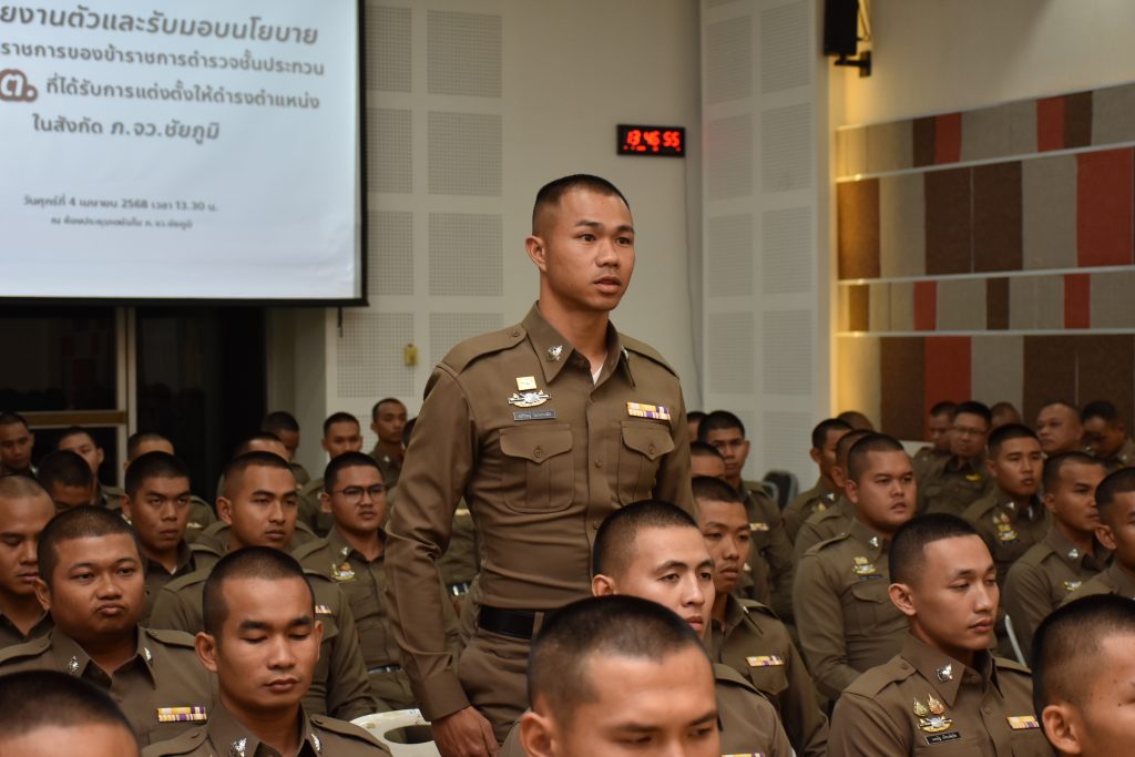 4 เม.ย.68 เวลา 13.30 น. พล.ต.ต.สุจริต ปาณเล็ก ผบก.ภ.จว.ชัยภูมิ พร้อมด้วย พ.ต.อ.อิทธิโชค เกิดผล รอง ผบก.ฯ, พ.ต.อ.สุขสันต์ ไตรทิพย์ รอง ผบก.ฯ, พ.ต.อ.วัฒนชัย จันหาทุม รอง ผบก.ฯ และ พ.ต.อ.อานุภาพ ผิวอ่อน รอง ผบก.ภ.จว.ชัยภูมิ ร่วมมอบนโยบายการปฏิบัติราชการของข้าราชการตำรวจชั้นประทวน มียศ ส.ต.ต. ที่ได้รับการแต่งตั้งให้ดำรง ตำแหน่งในสังกัด ภ.จว.ชัยภูมิ ณ ห้องประชุมเตชะธัมโม ภ.จว.ชัยภูมิ