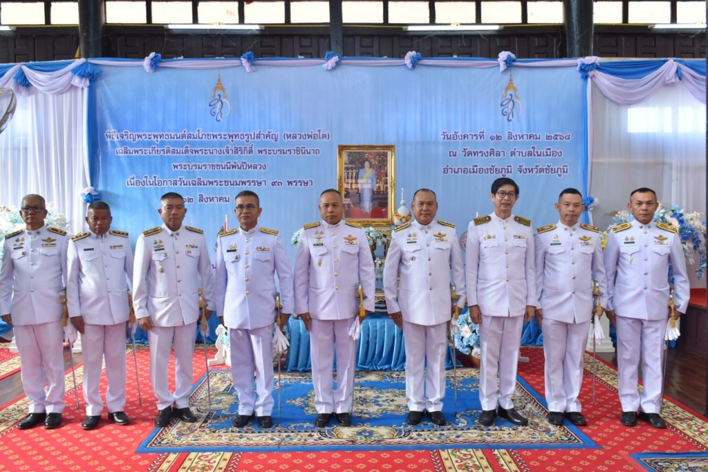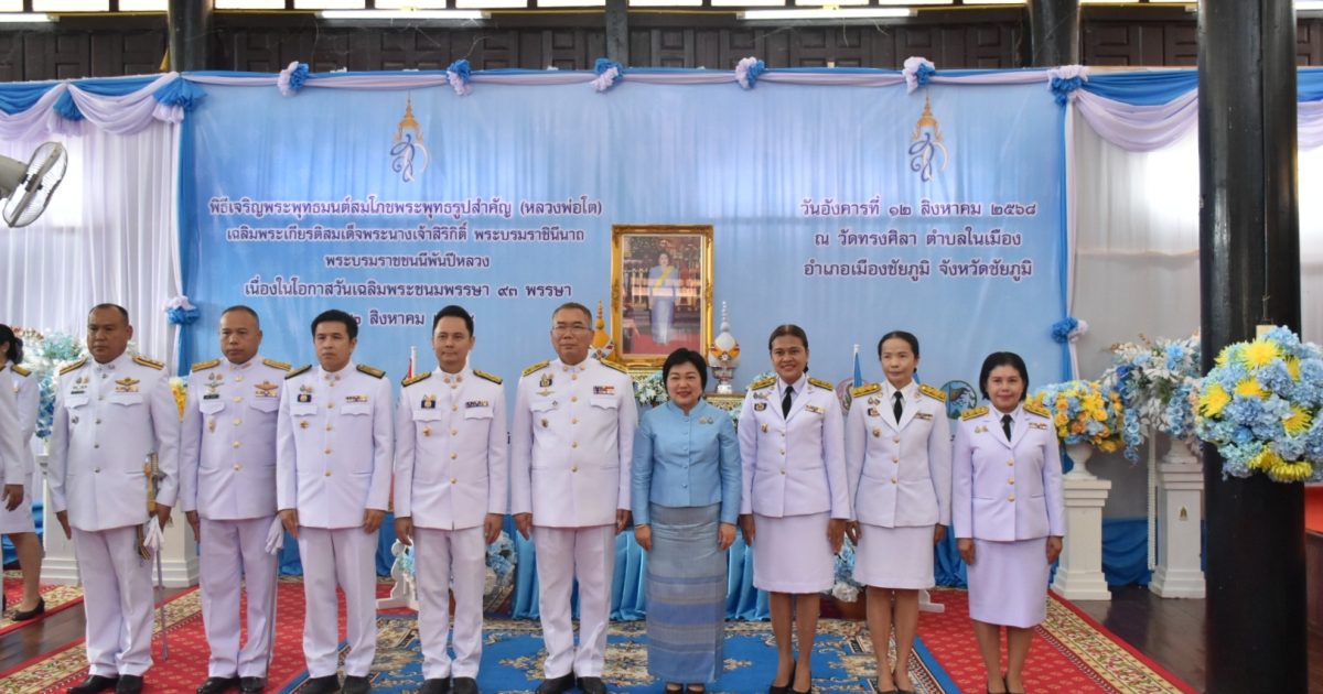12 ส.ค.68 เวลา 08.30 พล.ต.ต.สุจริต ปาณเล็ก ผบก.ภ.จว.ชัยภูมิ มอบหมายให้ พ.ต.อ.สุขสันต์ ไตรทิพย์ รอง ผบก.ภ.จว.ชัยภูมิ พร้อมด้วย ข้าราชการตำรวจ ภ.จว.ชัยภูมิ ร่วมพิธีเจริญพระพุทธมนต์สมโภชพระพุทธรูปสำคัญ (หลวงพ่อโต) เฉลิมพระเกียรติสมพระนางเจ้าสิริกิติ พระบรมราชินีมาถ พระบรมราชชนนีพันปีหลวง เนื่องในโลกาสวันเฉลิมพระชนมพรรษา 12 สิงหาคม 2568 ณ ศาลาการเปรียญ วัดทรงศิลา พระอารามหลวง ต.ในเมือง อ.เมือง จว.ชัยภูมิ