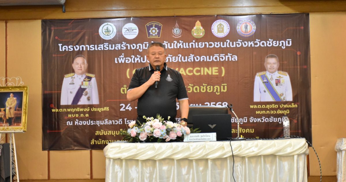 พล.ต.ต.สุจริต ปาณเล็ก ผบก.ภ.จว.ชัยภูมิ ร่วมการฝึกอบรมวิทยากรต้มแบบ โครงการเสริมสร้างภูมิคุ้มกันให้แก่ยาวชนในจังหวัดชัยภูมิ เพื่อให้ปลอดภัยในสังคมดิจิทัล (Cyber Vaccine)
